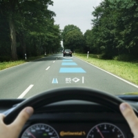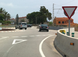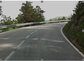 P-33 Reduced visibility is a warning triangle with a car and three diagonal black lines like fog or rain, this sign warns of general reduced visibility (fog, rain, snow, smoke, dust, etc.). The panel is rectangular (complementary panel) placed under a circular speed limit sign, which makes it different in meaning. It is used to lower speeds specifically on wet pavement, which is by rain and not wet with fog