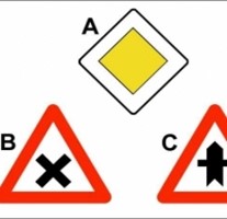 The right-hand priority intersection sign B indicates that we are approaching an intersection where the general right-of-way rule applies and is the only one of the three signs that requires yielding to other vehicles. Sign A informs us that we are driving on a road that will have priority over other roads when we reach an intersection, so we should NOT give way. Signal C, on the other hand, warns us that we are approaching an intersection where we will have the right of way and other drivers approaching on the roads we cross must yield to us.